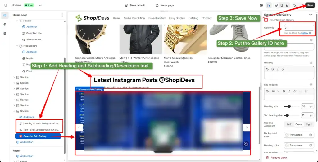 After clicking on the ‘Publish’ button, it will redirect you to the Shopify store customizer. And also, it will automatically add an app block for Essential Grid Gallery.